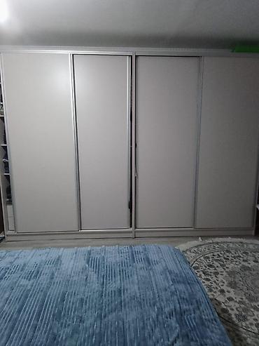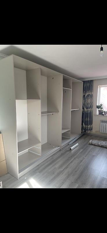 - Большой шкаф‑купе на 4 раздвижных дверях с алюминиевыми направляющими. Внутри — секции под длинную и короткую одежду, полки и ниши; предусмотрены места под штанги и выдвижные элементы.