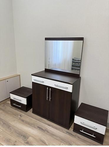 - Комод/туалетный стол с большим прямоугольным зеркалом. Верхняя выдвижная секция и нижнее отделение с двустворчатыми дверцами.