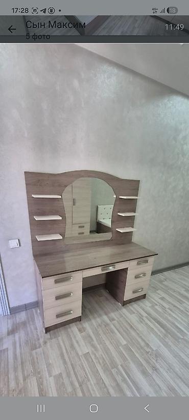- Туалетный/рабочий стол с зеркалом. По бокам – открытые полочки, в нижней части восемь выдвижных ящиков и центральная ниша под стул.