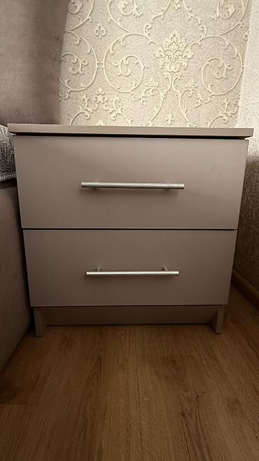 - Две прикроватные тумбы: по 2 выдвижных ящика каждая, длинные металлические ручки, низкие опоры.