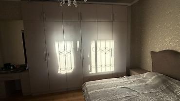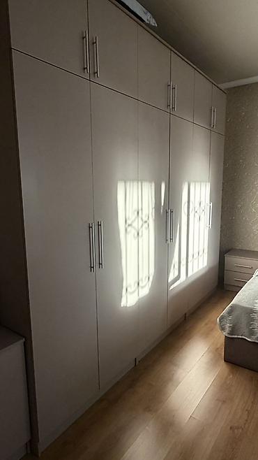 - Большой платяной шкаф-купе распашного типа во всю стену: многосекционный, с 8 дверцами, вертикальные металлические ручки, ровные глянцево-матовые фасады. Предусмотрено хранение для одежды на вешалках и полках.