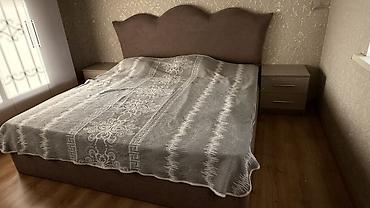 - Двуспальная кровать с высоким мягким изголовьем фигурной формы. Основание — короб с высоким бортом; покрытие из велюра/замши на ощупь мягкое. На кровати плед нейтрального серо-бежевого оттенка с орнаментом.
