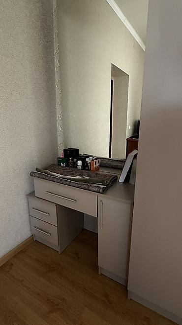 - Туалетный/рабочий столик с зеркалом и тумбой с ящиками (виден на фото слева от шкафа).