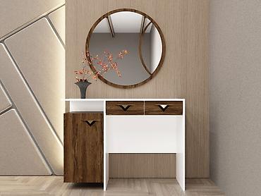 - Туалетный столик/трюмо: столешница белая, слева шкафчик с дверцей, сверху два выдвижных ящика; круглое настенное зеркало в тон рамке под дерево.