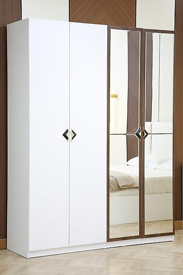 - Шкаф-купе распашного типа на 4 двери: две глухие белые створки и две зеркальные, обрамление под дерево; декоративные ручки.