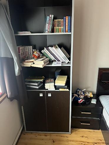 - Открытый стеллаж/пенал с полками и нижним закрытым отделением на распашных дверцах.