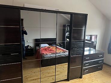 - Шкаф-купе большой, центральные двери с зеркалами в полный рост; боковые секции с глухими фасадами.