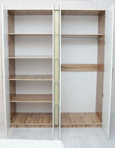 - Шкаф распашной четырехстворчатый: центральные фасады — крупные зеркальные панели с расшивкой на квадраты, боковые створки белые; корпус под дерево. Внутри — секции для одежды, штанги и полки (комбинированное хранение).