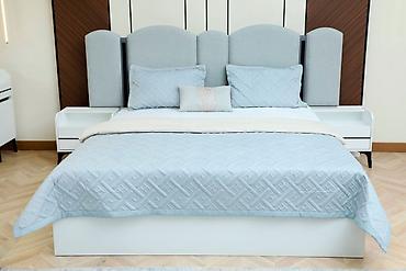 - Кровать двуспальная с высоким мягким изголовьем из текстиля серо-голубого цвета; основание на подиуме, строгий прямоугольный короб.