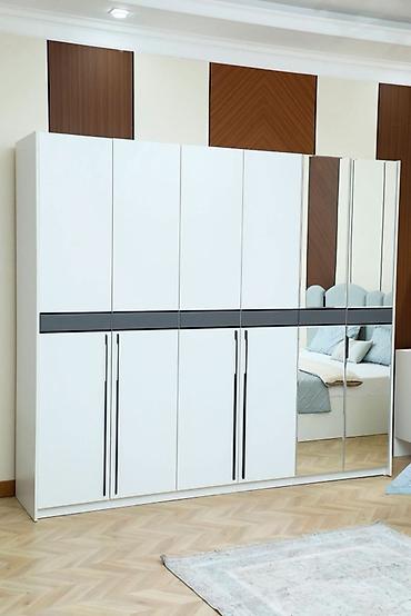 - Вместительный шестидверный шкаф-распашной модуль: 4 глухие двери и 2 зеркальные створки в центре. Внутри — две полноценные секции с перекладинами для вешалок и нижними полками, а также центральный блок из нескольких регулируемых полок для одежды и текстиля.