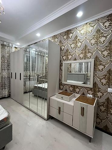 - Комод-трюмо: тумбовый блок на высоких ножках, центральные выдвижные ящики, боковые дверцы, две верхние открытые ниши с декоративными вставками; настенное зеркало в раме.