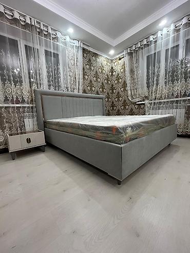 - Двуспальная кровать с мягким высоким изголовьем из ткани/велюра серого цвета, вертикальная стёжка, декоративная окантовка. Низкий короб на опорах.