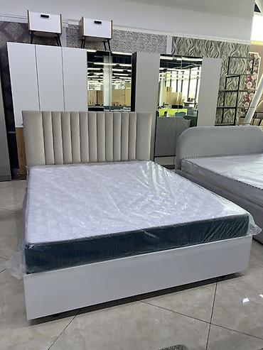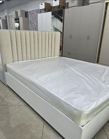 - Кровать с высоким мягким изголовьем вертикального каретного стёжки в светлой обивке. Корпус кровати — белый, лаконичный, под матрас стандартного двуспального размера.