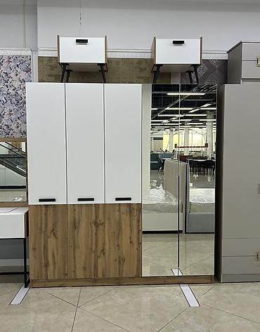 - Трёхстворчатый шкаф с комбинированной отделкой (белый матовый + дуб/орех). Левая секция с системой полок, две центральные секции с полноценными штангами для одежды, нижние ниши под коробки/обувь. Правая секция дополнена выдвижным ящиком и открытыми отсеками. На фасадах — прямые чёрные ручки. Сбоку — высокий модуль с зеркальной раздвижной дверью во всю высоту.