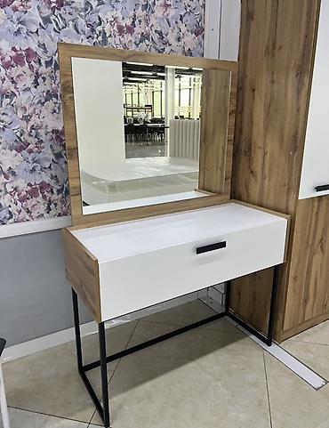 - Туалетный столик/консоль с большим настенным зеркалом в рамке под древесину. Широкий выдвижной ящик, опоры из чёрного металла в виде П‑образной рамы — устойчивые и визуально лёгкие.