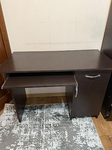 - Письменный/компьютерный стол: выдвижная полка под клавиатуру, тумба с дверцей и выдвижным ящиком, удобные металлические ручки.