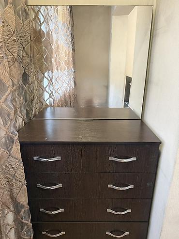 - Комод с большим настенным зеркалом: пять выдвижных ящиков на роликовых направляющих, просторная столешница, широкое прямоугольное зеркало.