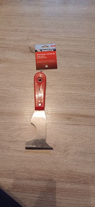 Подходит для работ по дереву, металлу, бетону, пластиковым и окрашенным поверхностям. На фото — несколько идентичных скребков. Маркировка на ярлыке: Matrix, «ШПАТЕЛЬ-СКРЕБОК. Стальное полотно. Пластиковая рука».