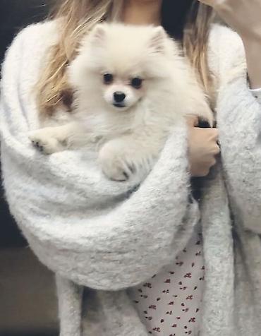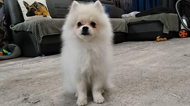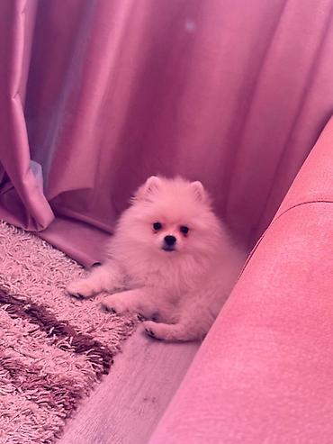 Померанский шпиц, белого окраса (cream/white), компактного формата. Плюшевая шубка с густым подшёрстком, аккуратные стоячие ушки, выразительные тёмные глаза и чёрная мочка носа. Нежный характер, любит объятия и игры дома. Подходит для жизни в квартире: миниатюрный размер, легко переносит поездки и груминг. мальчик