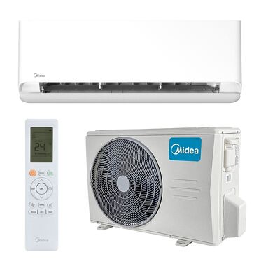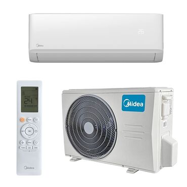Сплит-система Midea, предназначенная для эффективного охлаждения и обогрева помещений. Включает в себя внутренний блок с черной глянцевой панелью, отображающей текущую температуру и статус Wi-Fi, а также наружный блок, обеспечивающий циркуляцию воздуха. Комплект поставляется с удобным пультом дистанционного управления для легкой настройки режимов работы и температуры. Идеально подходит для создания комфортного микроклимата в доме или офисе.