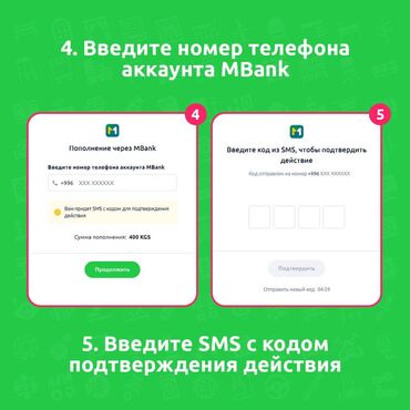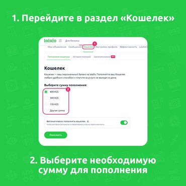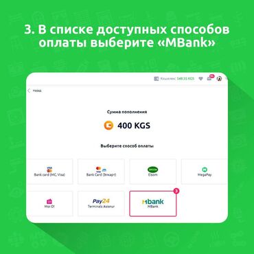 1. lalafo аккаунтуңузга кириңиз. "Капчык" бөлүмүнө өтүңүз. Толуктоо үчүн керектүү сумманы тандаңыз. 2. Жеткиликтүү төлөм ыкмаларынын тизмесинен "М Банкты" тандаңыз. 3. MBank эсебиңиздин телефон ном...