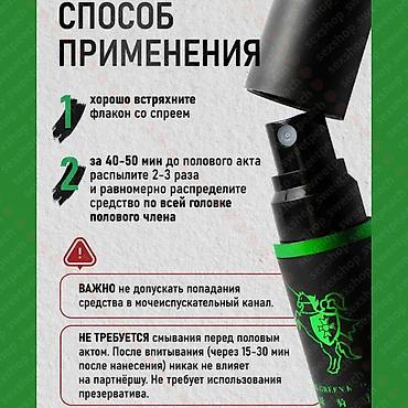 2) За 40–50 минут до полового акта сделать 2–3 распыления и равномерно распределить по всей головке полового члена.