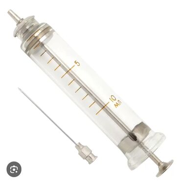 Стеклянный инъекционный шприц многократного применения с металлическим поршнем и градуировкой до 10 мл. Подходит для медицинских и лабораторных целей, где требуется точное дозирование жидкостей. В комплекте идет игла для инъекций.
