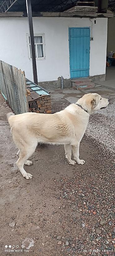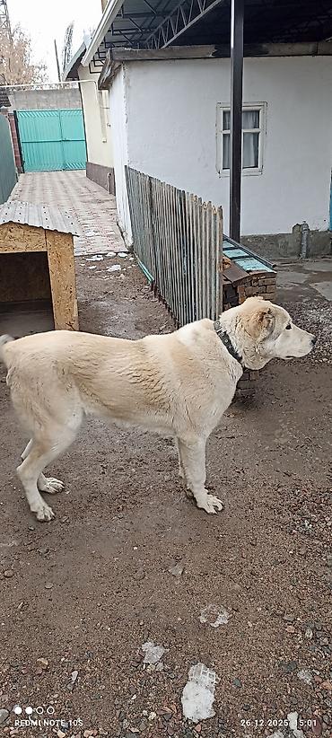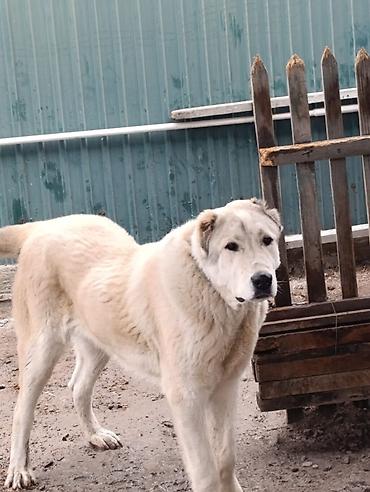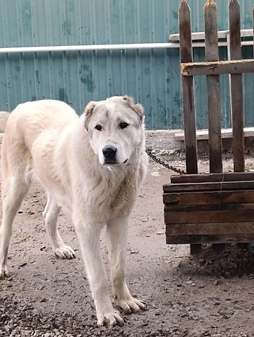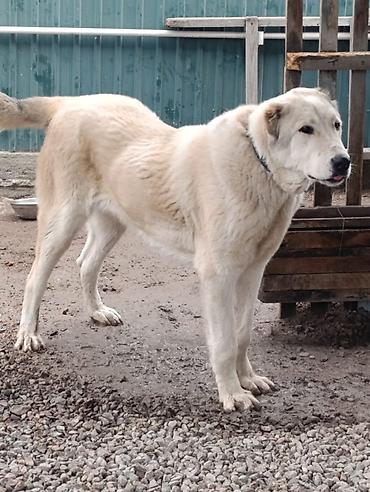 Собака крупного типа, белая с чёрными пятнами. Плотный костяк, широкая грудь, мощные лапы, густая шерсть средней длины. Хвост пушистый, уши полустоячие/прилегающие. На фото — на поводке-ремне. Под...
