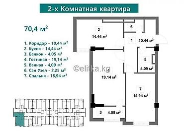 2 комнаты, 70 м², Элитка, 7 этаж, ПСО (под самоотделку)