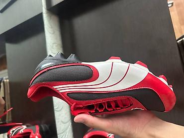 - Модель с классическим агрессивным дизайном Puma: крупные логотипы по бокам, контрастное сочетание красного, черного и белого.
