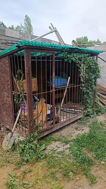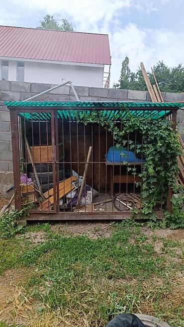 Срочно! Цена окончательная. Просторный вольер для содержания крупных собак или других животных. Каркас выполнен из прочного металла, обеспечивающего надежность и долговечность конструкции. Крыша покрыта зеленым шифером, защищающим от осадков и солнца. Задняя и боковые стенки обшита коричневыми деревянными плитами. Идеально подходит для использования на открытом воздухе. Без торга.