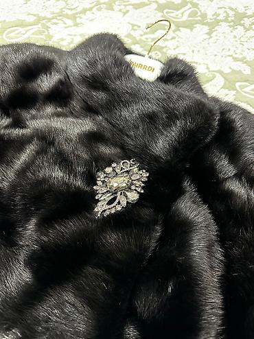 Шуба из тёмно-серого меха (норка), классическая длина ниже колена. Прямой силуэт с лёгким расклёшем к низу, длинные рукава. Воротник-стойка защищает шею от ветра. Подкладка тёмного цвета. Подход...