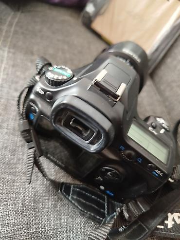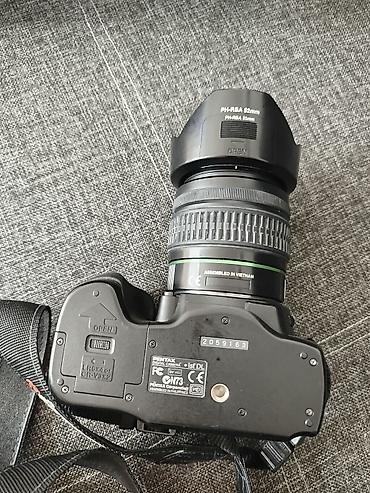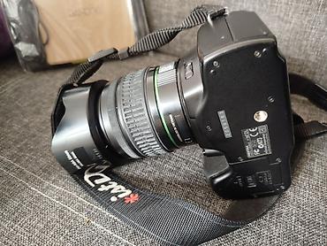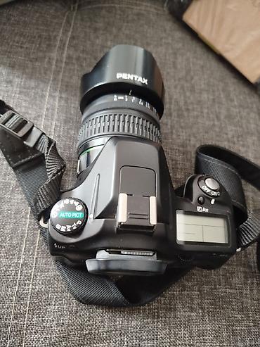 Цифровая зеркальная камера Pentax черного цвета с объективом и блендой. Модель оснащена видоискателем, дисплеем и различными кнопками управления, расположенными на верхней панели. На объективе присутствуют кольца для настройки фокуса и диафрагмы. Камера подходит для широкого круга задач, от любительской съемки до более продвинутых фотографических проектов. В комплекте идет ремень для удобной переноски.