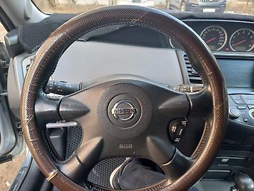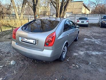 Nissan Primera седан, серебристый цвет, кузов P12. Номерные знаки KG видны на фото. японец Основные характеристики по фото: - Кузов: 4‑дверный седан, аэродинамичный дизайн P12 - Цвет: серебристый...