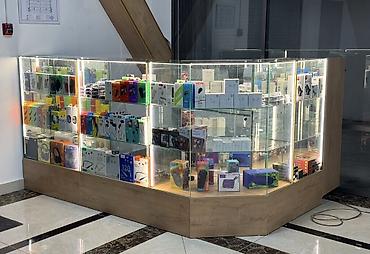 - Прозрачные стеклянные витрины по периметру с внутренними стеклянными полками.