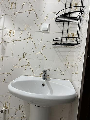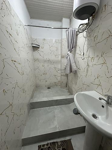 - Санузел/душевая: облицовка плиткой, подиум с душевой зоной и шторкой, умывальник на пьедестале, водонагреватель.