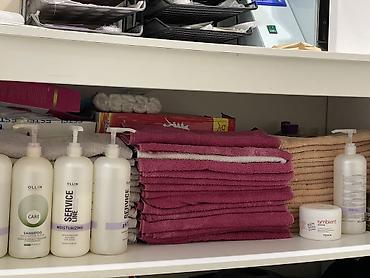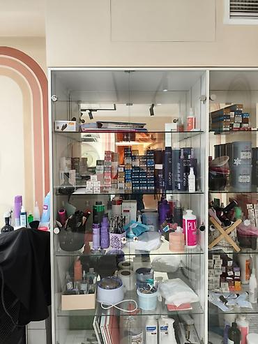 - Полки и витрины с косметикой и расходниками: красители, оксиданты, уходовые средства, стайлинг, кисти, миски, зажимы, фольга, бигуди, расчёски, брашинги, феновые насадки, одноразовые принадлежности, антисептики.