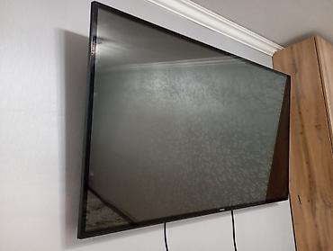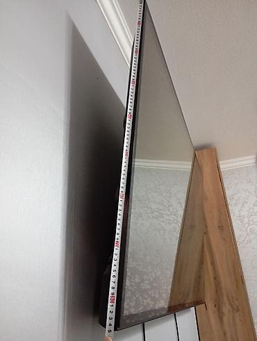 Срочно Телевизор с большим плоским экраном, диагональ около 85–147 см по вертикали корпуса (ориентировочно 43–50"). Тонкие рамки, глянцевая панель. Настенное крепление уже установлено: телевизор подвешен близко к стене, корпус тонкий.