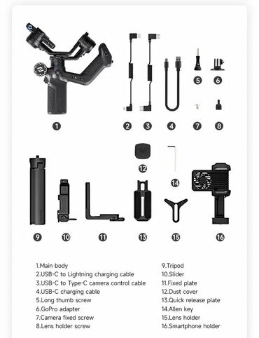 - Трехосевая стабилизация с эргономичной рукояткой и встроенным джойстиком управления.