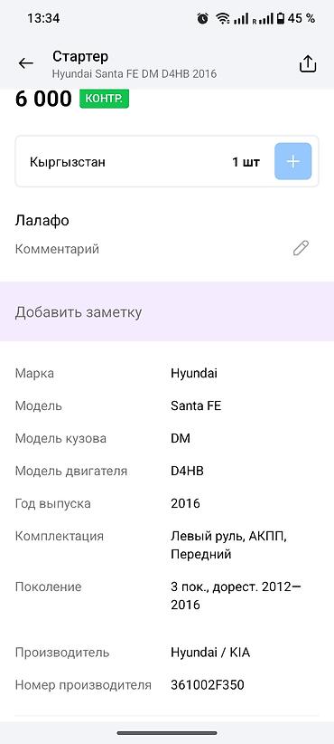 - Оригинальный стартер для Hyundai Santa Fe DM, двигатель D4HB, год 2016 (3‑е поколение, дорестайлинг 2012–2016)