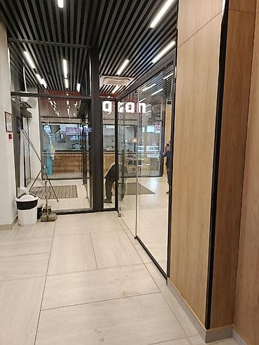 - Заполнение: закаленное прозрачное стекло, цельные полотна по высоте помещения
