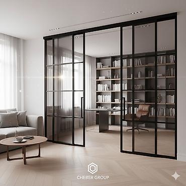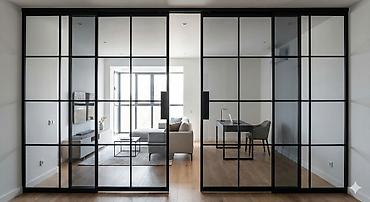 - Применение: зонирование спальни и гардеробной, кабинета, гостиной, кухни‑столовой; сохранение естественного света при изоляции звука и запахов.