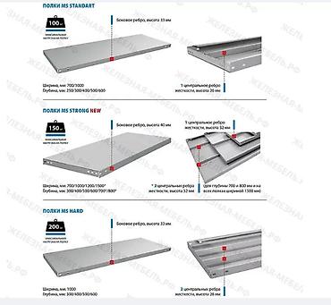 - Rаждая полка усиливается 1 или 2 (в зависимости от габаритов) центральными ребрами жёсткости высотой 32 мм