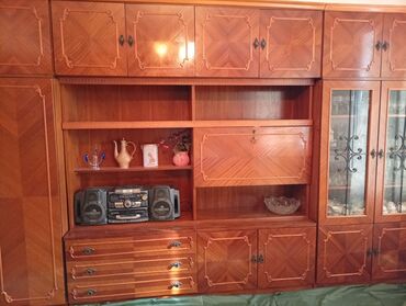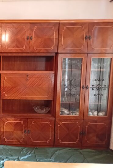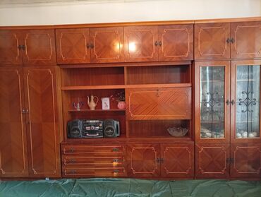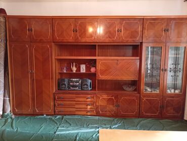 Представляем стенку для гостиной, выполненную в классическом стиле из дерева с характерной текстурой. Эта модульная мебель предлагает разнообразные секции для хранения: платяной шкаф с двумя дверцами, несколько верхних шкафов с распашными дверцами для книг или посуды, а также открытые полки для декора и электроники. Центральная часть оборудована выдвижными ящиками и закрывающимся отделением, которое может служить письменным столом или баром. Боковые витрины со стеклянными дверцами и декоративными металлическими элементами идеально подходят для демонстрации коллекций. Эта стенка — универсальное решение для организации пространства в гостиной или кабинете.