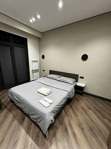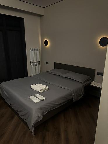 - Уютная спальня с двуспальной кроватью, комплектами постельного белья, полотенцами и одноразовыми тапочками.