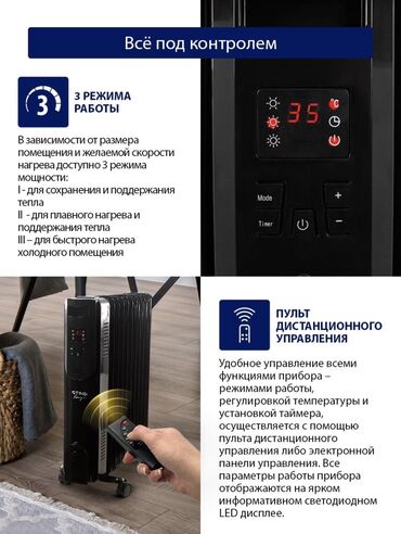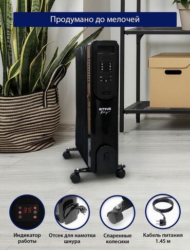 Масляный обогреватель STINGRAY, 11 секций, Размер секций: 120x550 мм, 3000 Вт, электронное управление, Пульт ДУ, установка напольная, системы защиты, 3 режима работы, световой индикатор работы, длина сетевого шнура 1. 45 м., Таймер от 1 до 12 часов, Отсрочка старта. Обогреватель безопасен в эксплуатации, не сжигает кислород в помещении и обладает функцией защиты от перегрева, оборудован встроенным термостатом, имеет 3 температурных режима, а также индикатор режимов работы. Обогреватель можно свободно перемещать при помощи колес и удобной ручки, предусмотрено место для хранения шнура. Маслонаполненный радиатор – это эффективный отопительный прибор в классическом исполнении. Технология масляного нагрева обладает максимальной теплоотдачей и энеггоэффективностью, НЕ СУШИТ воздух и НЕ ВЫЖИГАЕТ кислород - это очень важно в небольших помещениях с ограниченным воздухообменом, ведь от содержания кислорода в окружающем воздухе зависит самочувствие степень работоспособности, и качество отдыха. Работа прибора полностью бесшумная.