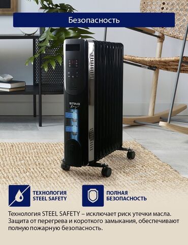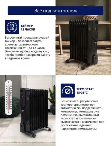Масляный обогреватель Кол-во секций: 10 и более, Отключение при перегреве, Отключение при падении, Защита от замерзания