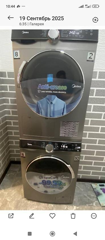 Стирально-сушильная машина Midea, фронтальная загрузка, серия с черным стеклянным люком и графитовым корпусом.