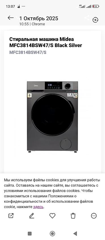 Подходит для семьи: барабан 8 кг, комбинированные циклы «стирка+сушка» и самостоятельные режимы. Современный дизайн Black Silver с информативной панелью. На корпусе отмечены 2 года гарантийного обслуживания от производителя и 10 лет на инверторный двигатель (по информации на стикерах устройства).