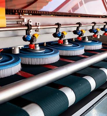 - Оборудование ленточного типа с автоматической подачей и несколькими щеточными валами — равномерная обработка без деформации ворса.
